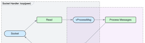 The behavior of the Message Handler Thread is similar to the Socket Handler Thread. Both loops each connected peer in the round-robin way. And for each peer, they first process incoming messages, and then send outgoing messages. The difference is that Message Handler Thread reads messages from the queue vProcessMsg and queues outgoing messages in the queue vSendMsg.